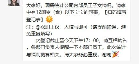 哇,真有其事!这不是天上掉馅饼吧,砸中的真是福气。公司四百多名员工,二百多个八亿宝宝(12周岁以内的),光拥有12周岁以内二孩的,就有35个家庭,这么好的福利,做梦都能笑出声来,符合条件的个个都露着笑脸,来登记的,登记完的,连说没想到,没想到每个月都有,没想到每个孩子都有,没想到一直能发到12周岁,一个孩子500元,两个孩子1000元,三个孩子1500元,无任何折扣。这项福利来的太突然了,激动激动,周围的亲朋好友还没听说过有这等好事的,而且公司依据北京市相关规定,增加了产假天数、育儿假、独生子女护理假,这项决策真是给了八亿的员工们极大的鼓舞,这么好的福利不得不让人翘起大拇指,我们的领导不愧是全心全意为员工着想的好领导!我们公司不愧是全心全意为员工着想的好公司!我们为能在这样的公司工作感到自豪!
