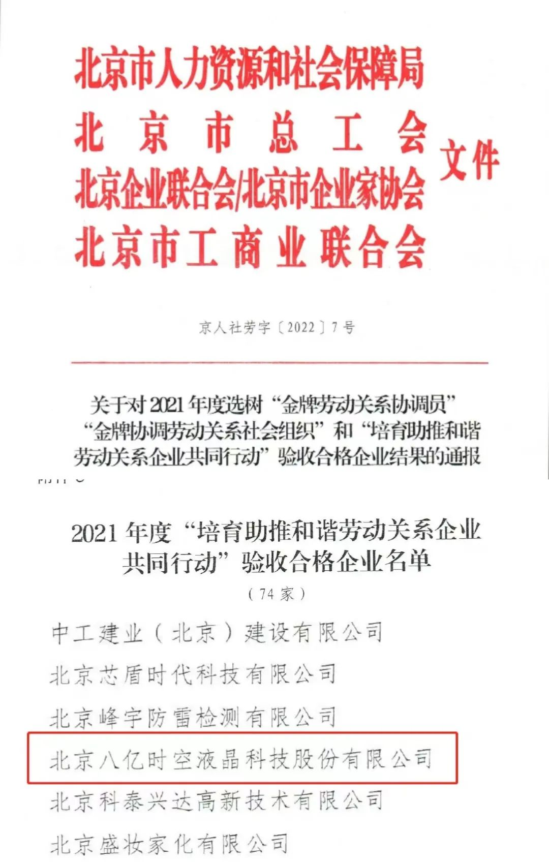 我司被北京市人社局、北京市总工会、北京企业联合会、北京市工商联 联合评为2021年度“培育助推和谐劳动关系企业共同行动”验收合格企业(全北京共74家)。