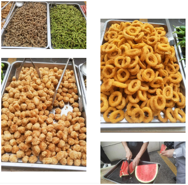 现场美食区:公司采购早早准备好了各式休闲零食,各种饼干、糕点,还有食堂现烤的香肠、鸡米花、毛豆、花生等等,给现场增添了一道亮丽的风景线。美食是用来享受的,看着,闻着,甚至想着,都可以当是一种享受,在忙碌一天后,享受到轻松愉悦的氛围和美食的慰藉真是惬意。