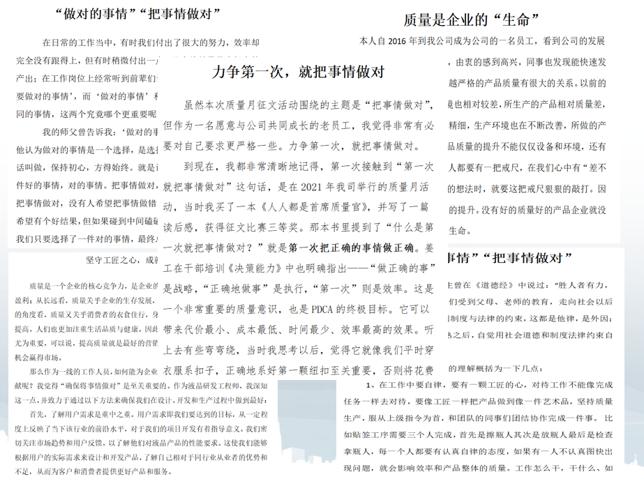 质量征文活动,通过设置“把事情做对”这一主题,希望大家能够深入思考,把“做对”这一目标对齐。做对,是意识,是态度,更应该是习惯。“做对”不是“做完”,也不是“这次合格就行”。大家踊跃参与,用一篇篇文章表达出了对质量月主题的思考和见解。征文中印象较深的是某同事征文的一句话“工作能力就是把事情做对的能力”,是能够体现本职工作的专业性。