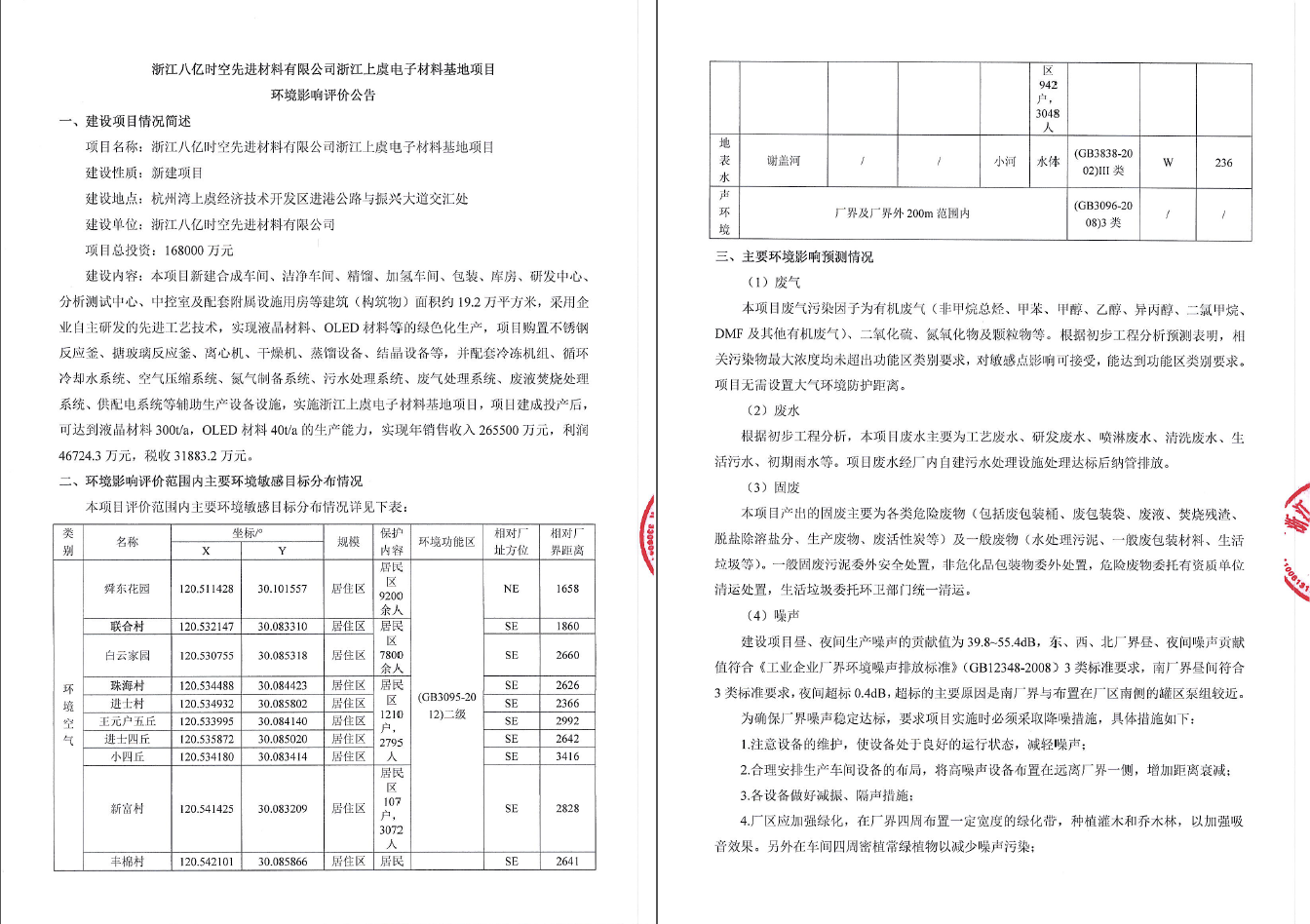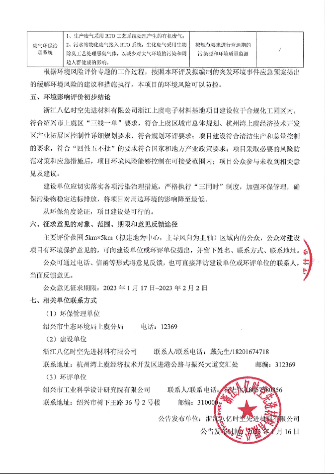 浙江八亿时空先进材料有限公司浙江上虞电子材料基地项目(二期)(先行) 竣工环境保护验收公示