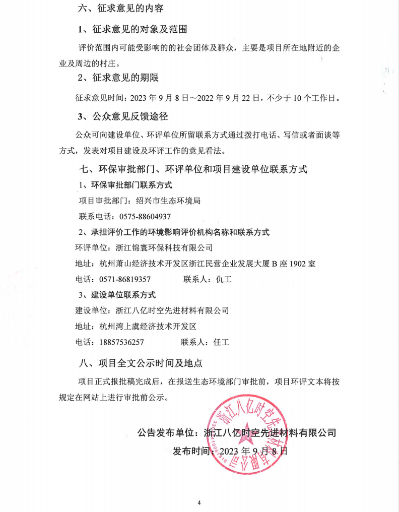 浙江八亿时空先进材料有限公司浙江上虞电子材料基地项目(二期)(先行) 竣工环境保护验收公示