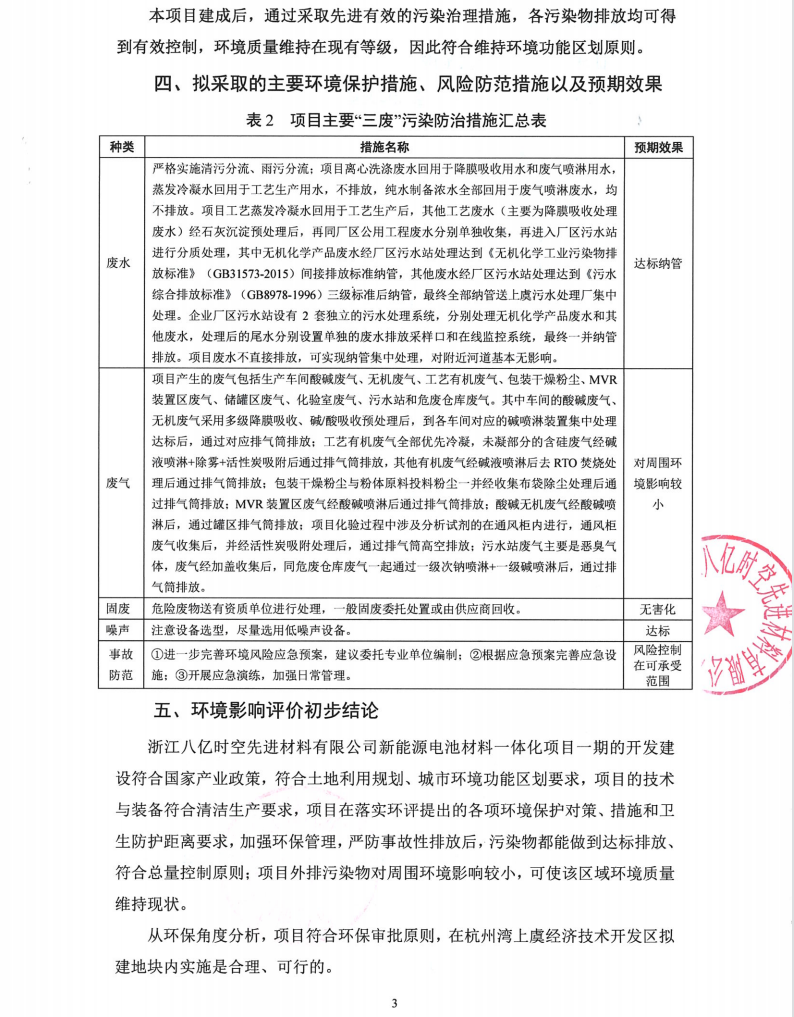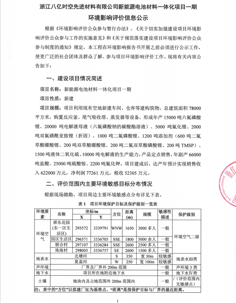 浙江八亿时空先进材料有限公司新能源材料电池一体化项目一期环境影响评价信息公示